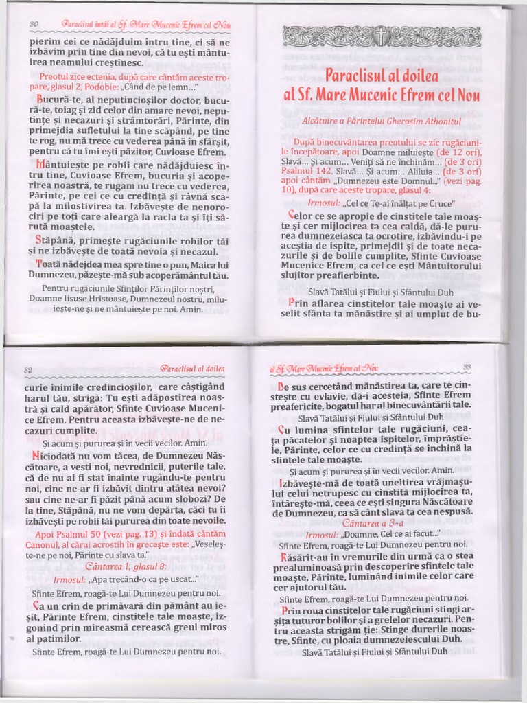 Acatistul sf efrem cel nou al doilea. Va țin la curent. Pentru aceasta ai făcut ca dumnezeiescul har să se reverse neîncetat spre cei ce cu evlavie îți strigă ție. Să se bucure credincioşii şi să se veselească mulţumindu i lui dumnezeu pentru aflarea sfintelor moaşte ale mult păti mi torului mucenic efrem prin care se revar să mulţime de minuni şi se arată mul ţi me de tămăduiri şi să îi cânte în tr un glas robului său. In mai 2010 citeam din nou acatistul pentru ca din 2008 de cand m am casatorit si pana in 2010 nu am reusit sa raman insarcinata.
