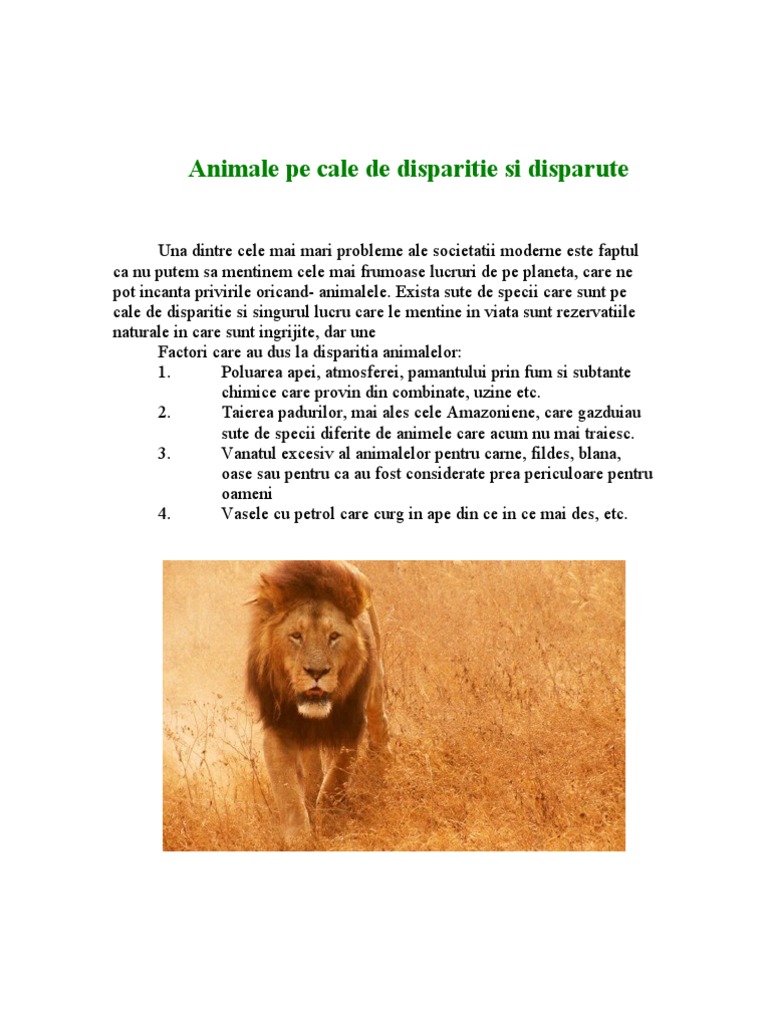 Animale pe cale de disparitie referat. Cele mai drăguţe animale sunt pe cale de dispariţie concurența pentru supraviețuire deși toate speciile pe cale de dispariție merită să fie salvate nu este surprinzător faptul că cei mai simpatici reprezentanți din regnul animalier au un pic mai multe şanse de a fi protejate. Detinem deci 62 de specii amenintate in diverse stadii de la critic la moderat. Alte câteva mii de speciii ajung în pragul disparitiei în fiecare an înainte ca biologii sa le poata identifica. Aceasta disparitie poate fi cauzata de dimensiunea mica a populatiei de pierderea habitatului si de braconajul practicat pentru alimentatie sau beneficii economice.