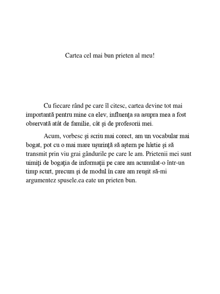 De când am descoperit o cartea s a dovedit a fi un prieten credincios răbdător care are întotdeauna timp pentru mine. De când am descoperit o cartea s a dovedit a fi un prieten credincios răbdător care are întotdeauna timp pentru mine. Cartea poate fi un mod de a ți petrece timpul liber o cale de a cunoaște lumea sau de ce nu un prieten bun.