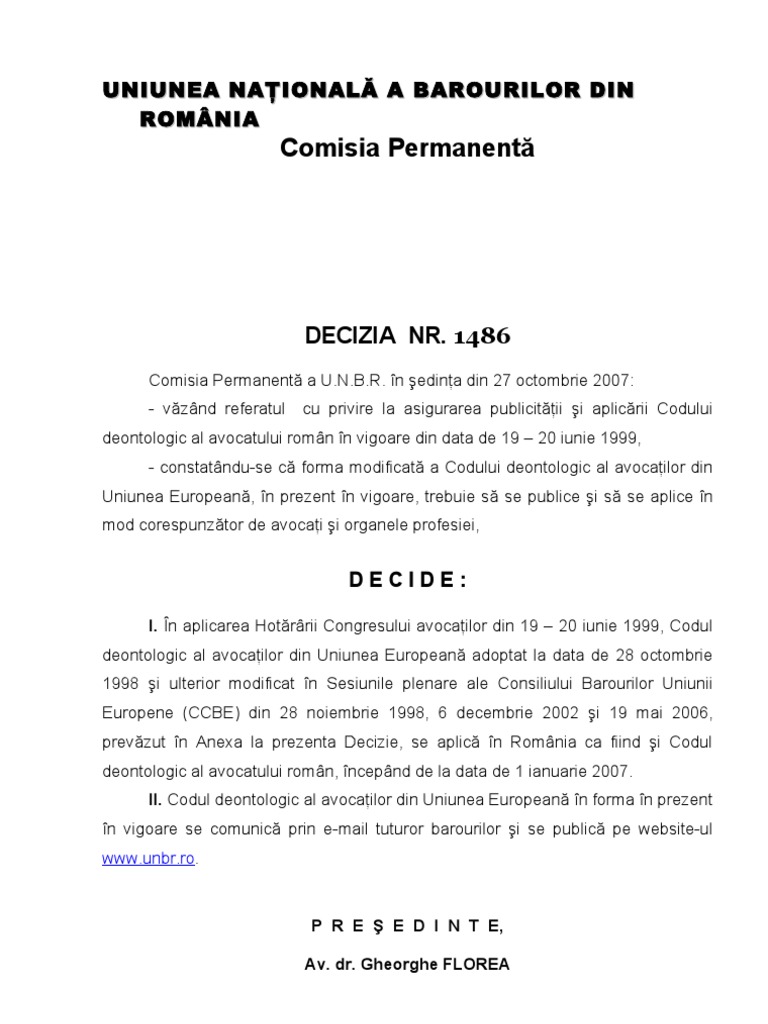 Avocatura este o profesie liberală unitară auto reglementată care se desfășoară în baza legii. Chişinau republica moldova telefon. Integral codul deontologic al avocatului european în continuare codul ca fiind și codul deontologic al avocatului român cu mult înainte de aderarea româniei la uniunea europeană. Codul deontologic oferă o oarecare detaliere pe subiectul secretului profesional de care este ținut avocatul.