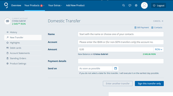 Transfer credit intrabancar între conturi proprii efectuat la ghi şeele b ăncii.