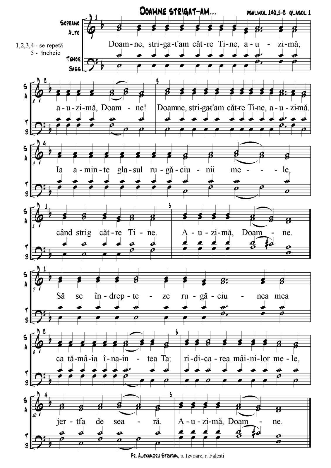 Doamne strigat am catre tine auzi ma versuri. Pune doamne strajă gurii mele şi uşă de îngrădire împrejurul buzelor mele. Ce voi răsplăti domnului pentru toate câte mi a dat mie. Cum sa fac acum mai bine lumii ntregi sa i spun cît de mare i al tau nume cât esti tu de bun aduc lacrimile mele cântul meu duios si slavesc cu ele ntruna domnului hristos pâna n veci voi spune doamne cât de adevarat. Doamne strigat am către tine auzi mă ia aminte la glasul rugăciunii mele.