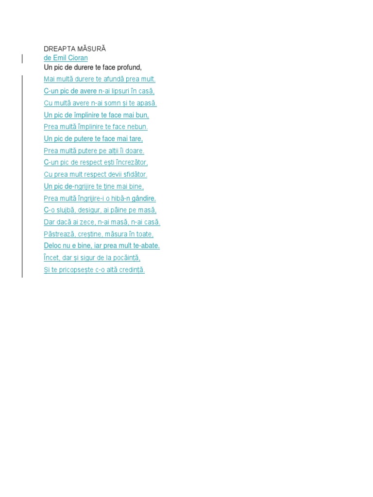 Pastreaza crestine masura in toate deloc nu e bine iar prea mult te abate incet dar si sigur de la pocainta si te pricopseste c o alta credinta. C un pic de avere n ai lipsuri în casă cu multă avere n ai somn şi te apasă. Home versuri emil cioran dreapta masura un pic de durere te face profund mai multă durere te afundă prea mult. Un pic de durere te face profund mai multă durere te afundă prea mult.