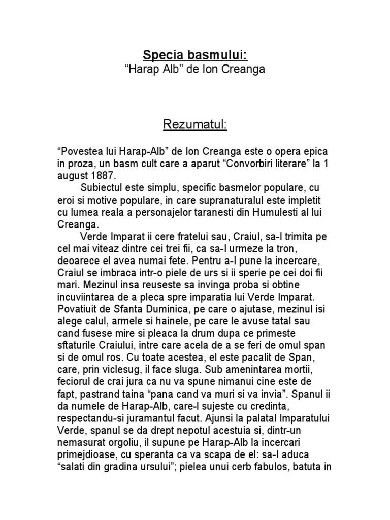 Harap alb de ion creanga rezumat. Rezumat scurt de o pagina word la celebra povestire povestea lui harap alb in care este vorba despre un crai care avea 3 fii si pe fratele său verde împărat care stăpânea o țară îndepărtată si nu avea mostenitori. Fantasticul este construit prin împletirea elementelor realiste cu cele fabuloase ca specific ancestral străvechi al basmelor însă în această proză narativă creangă îmbină supranaturalul popular cu evocarea. Povestea lui harap alb de ion creanga rezumat un crai are trei fii. Povestea lui harap alb de ion creangă comentariu literar rezumat literar crispedia ro.