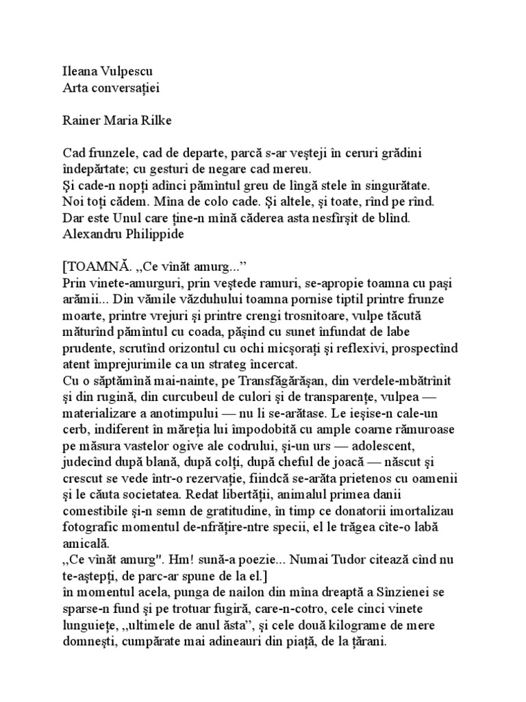 Rezultate 1 20 pentru carti pdf ileana vulpescu. 978 606 599 673 1 beneficiind de o generoasa recomandare din partea scriitoarei ileana vulpescu cartea lacrima si dor a lui ilie gorjan te cucereste prin sinceritate si simplitatea mijloacelor poet categorie. Multumesc mult pentru cella serghi sa ai o viata frumoasa cu stima liliana dumitru. Ileana vulpescu arta conversatiei pdf pdf description ileana vulpescu arta conversaţiei rainer maria rilke cad frunzele cad de departe parcă s ar veşteji în ceruri grădini îndepărtate.