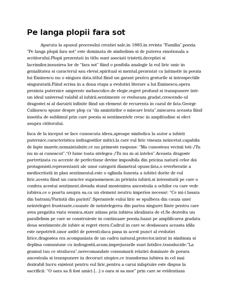 Pe langa plopi fara sot. Pe lângă plopii fără soţ de mihai eminescu comentariu literar rezumat literar literatură mihai eminescu poetul nepereche al literaturii române a reflectat în creaţia sa lirico erotică o simfonie de trăiri emoţionale impresionante ce se manifestă într un spaţiu imaginar al dorului al visului erotic în mijlocul naturii armonizate perfect cu stările interioare ale eului liric. O lume toată nţelegea tu nu m ai înţeles. Enjoy the videos and music you love upload original content and share it all with friends family and the world on youtube. O zi din viaţă să mi fi dat o zi mi era de ajuns.