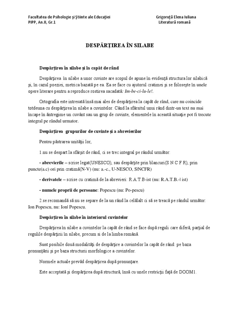 Regulile despărțirii în silabe. Reguli de despartire in silabe si la capat de rand. 0 stele 0 review uri. Silaba este segmentul fonic dintr unul sau mai multe sunete rostite cu acelasi efort respirator in componenta caruia trebuie sa existe o singura silaba conform doom 2. în cazul în care o vocală e urmată de o singură consoană aceasta trece la silaba următoare.