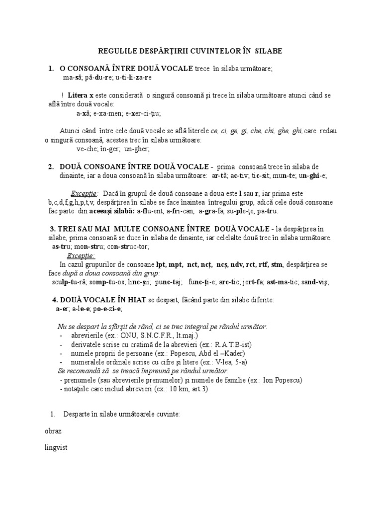 Această regulă se aplică şi în următoarele situaţii. Bu nă vo in ță in to le ra bil pre fa bri cat re a ni ma su pra a glo me rat etc. Normele actuale de despartire a cuvintelor si la capat de rand. O consoană între două vocale trece în silaba următoare.