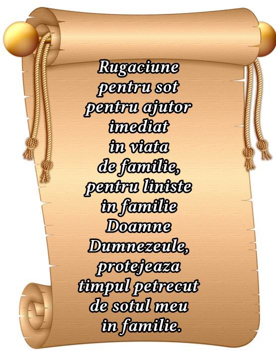 Rugaciune pentru sotul meu. Rugaciunea sotiei pentru sotul ei o doamne preabunule tu mi ai dat un sot al zilelor mele pe pamant partas sortii mele si sprijinul meu in vremea calatoriei acestei vieti. Doamne fereste familia mea si sufletele noastre de toate incercarile si rautatile si da ne doamne sanatate impliniri realizari si viata fara de primejdii doamne intareste ma si pastreaza mi credinta stramosilor credinta crestinilor doamne ocroteste pe parintii mei pe fratii mei pe surorile mele se spun numele lor si dezleaga blestemele viilor si mortilor cazute asupra noastra. Fa sa cunosc ca el se ingrijeste de mine si ajuta ma sa nu intristez niciodata zilele lui nici sa fiu nemultumitoare fata de cel care ma sprijina si ma ingrijeste. Rugaciunea sotiei pentru sotul bolna.
