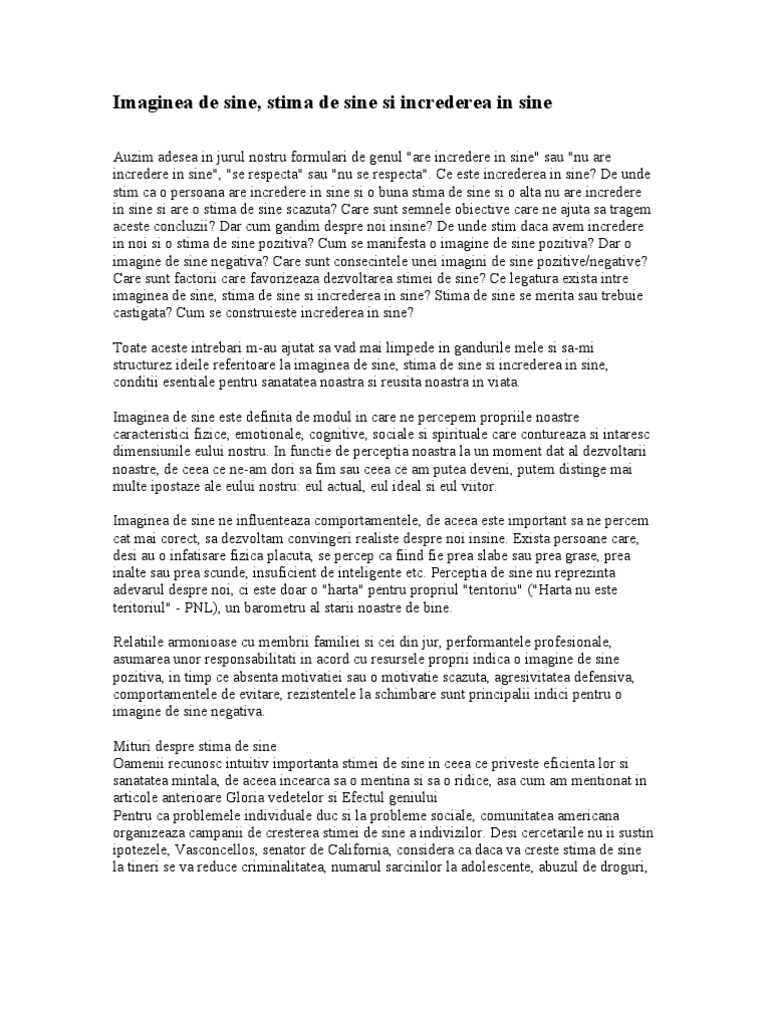 Ce este imaginea de sine. Ce este o stimă de sine crescută. Sentimentul de încredere anticipează apariţia stimei de sine. Mai jos poate fi vizualizat un extras din document aprox.