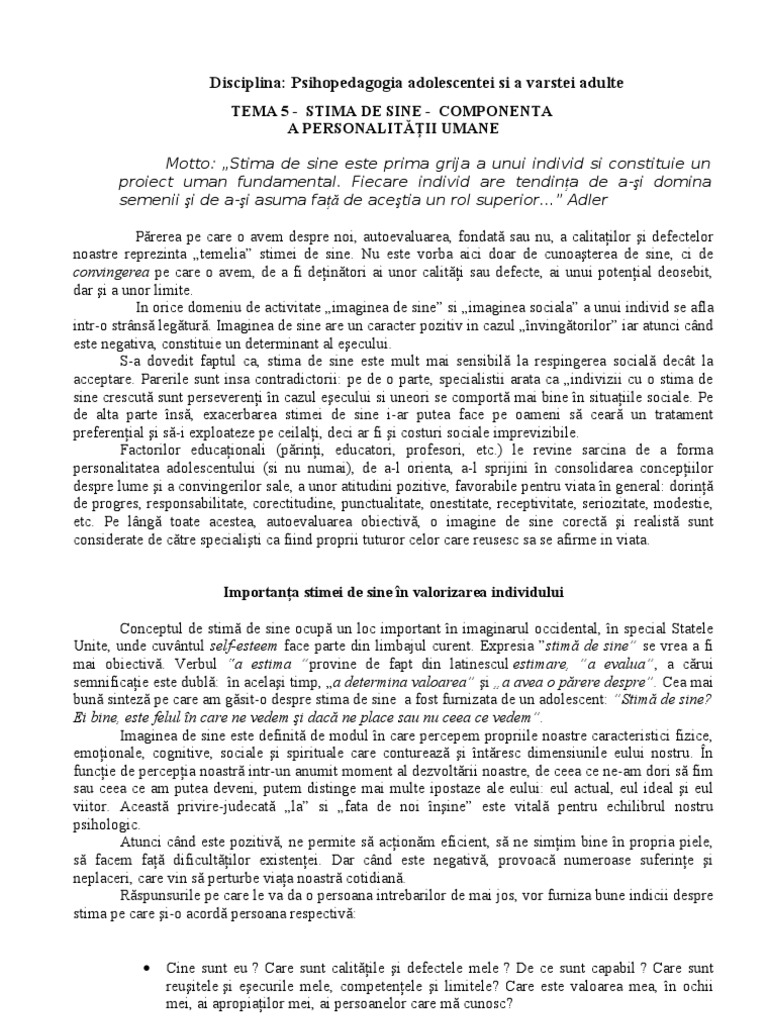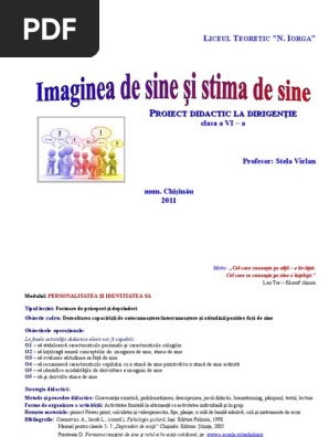 Iti recomandam sa te uiti bine pe extras si pe imaginile oferite iar daca este ceea ce ti trebuie pentru documentarea ta il poti descarca. Imaginea de sine sau cum ne vedem se refera asa cum se subintelege deja la modul in care ne percepem propriile noastre caracteristici fizice emotionale cognitive sociale si spirituale. V stima de sine este o dimensiune fundamentala pentru orice fiinta umana indiferent ca este copil adult sau varstnic indiferent de cultura personalitate interese statut social abilitati. Ai avut un insucces în dragoste te simţi singur etc.