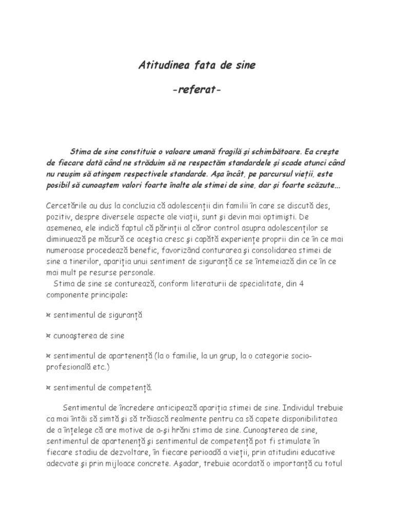 Acest referat descrie imaginea de sine. O stimă de sine scăzută apare când unul sau mai mulţi factori din cei enumeraţi mai sus sunt afectaţi şi imaginea de sine este influenţată. Stima de sine scăzută creşte sensibilitatea indivizilor la o gamă largă de rezultate problematice şi experienţe cum ar fi depresia tulburări de alimentaţie sarcina în adolescență victimizare dificultate în susţinerea şi formarea de relaţii strânse implicarea în comportament antisocial consumul de substanţe şi ideaţie şi tentative de suicid. în cea de a doua parte a lucrării am prezentat obiectivele ipotezele metodologia utilizată precum şi rezultatele unei cercetări prin care am comparat imaginea şi stima de sine evaluate pe un lot de 47 de adolescenţi instituţionalizaţi cu imaginea şi stima de sine psihologia online biblioteca online www psihologiaonline ro.