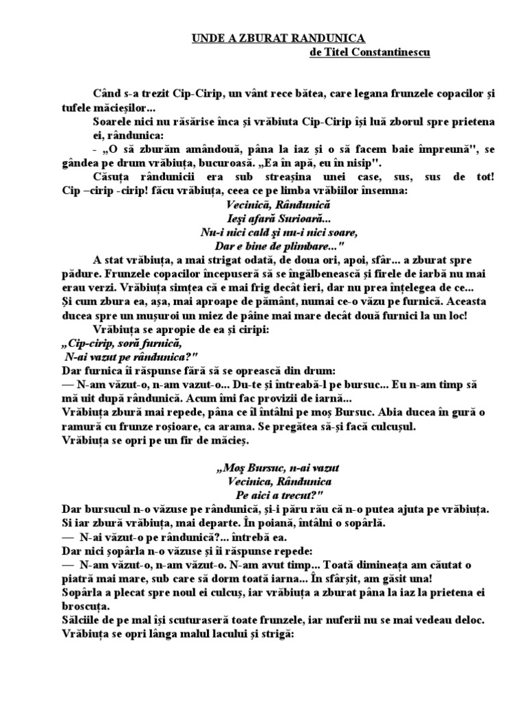 Unde a zburat randunica de titel constantinescu 5. Să lipească pe coroniță fructe legume flori păsări călătoare. Unde a zburat randunica titel constantinescu cand s a trezit cip cirip un vant rece batea care legana frunzele copacilor şi tufele macieşilor soarele nici nu rasarise înca şi vrabiuta cip cirip îşi lua zborul spre prietena ei randunica. Acest proiect de transmitere de cunostinte urmareste dezvoltarea exprimării orale înţelegerea şi utilizarea corectă a semnificaţiei structurilor verbale orale.